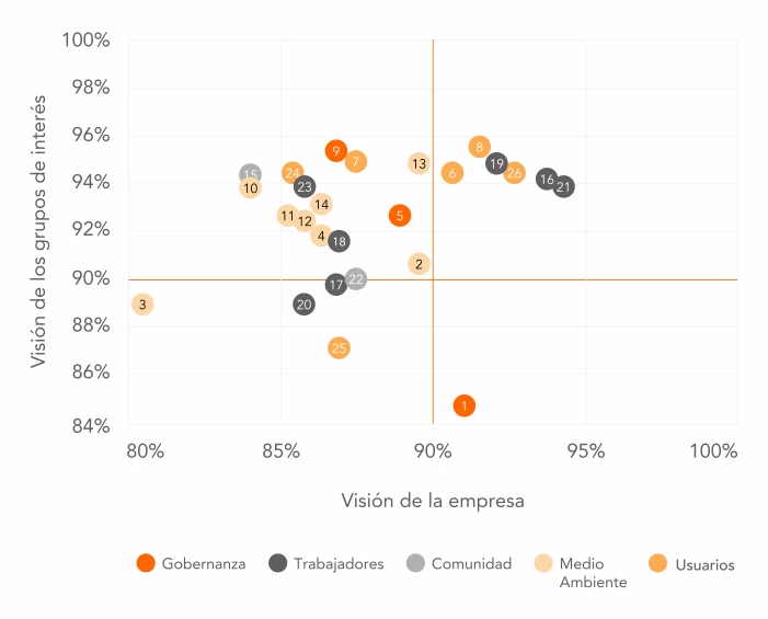 En la organización realizamos un análisis de materialidad en el que primeramente se listaron los temas materiales y depués se consultaron a nuestros grupos de interés, resultado de ello se obtuvo un listado de temas materiales para la medición del desempeño económico, social y de gobernanza de nuestra organización.